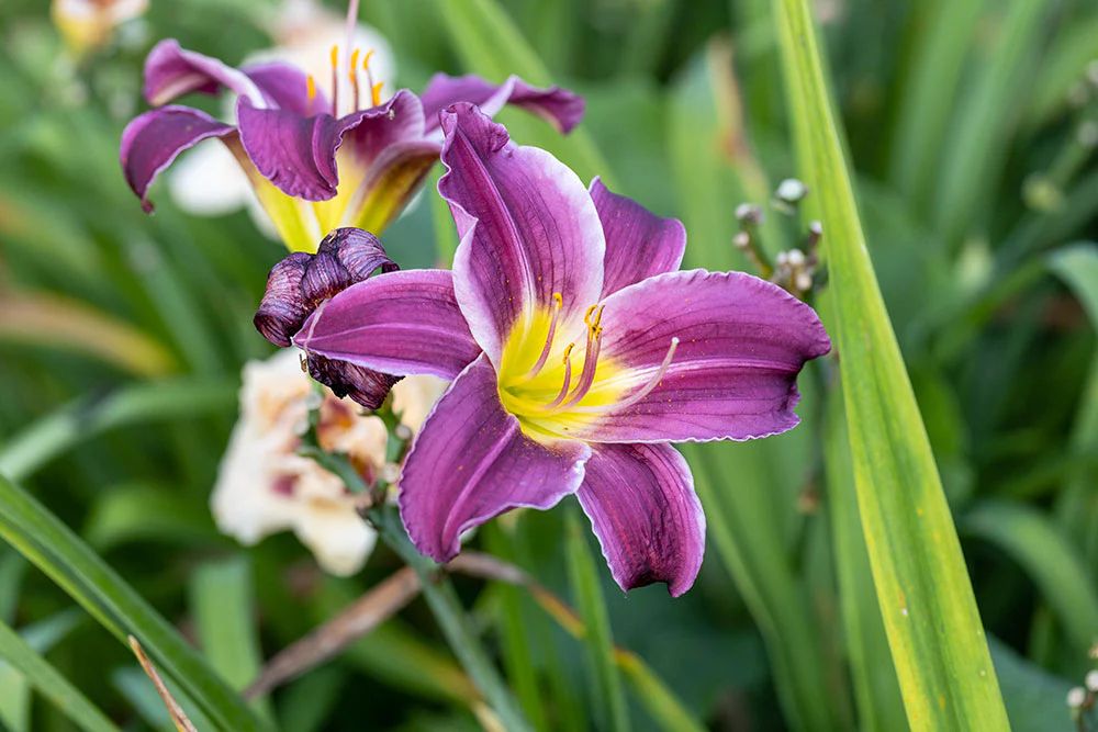 White and cream flowers offer another useful pairing, especially in evening gardens or areas viewed from indoors. Purple daylilies beside white phlox, pale roses, or airy gaura create a clear, readable combination that holds up even in low light. This is one of the most practical ways to use them in smaller gardens, where clarity often matters more than complexity.